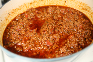 Die Pfanne mit Olivenöl beschichten und auf volle Hitze drehen. Das Tartar braun anbraten. Anschließend die Zwiebeln, Chili und den Knoblauch hineingeben und mitbraten. Ablöschen mit den Dosentomaten und mit den Gewürzen nach Geschmack würzen. Ca. 45 min köcheln lassen. 10 min vor Ende der Garzeit die Kidney Bohnen hineingeben. Wer mag, kann noch etwas Creme Fraiche dazugeben.
